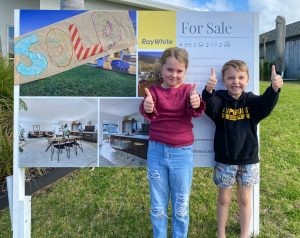 When Ray White Bream Bay salesperson James Alexander couldn’t get the sold sign to the property due to level 4 restrictions, the vendors’ children, Harper and Harry (pictured above), took matters into their own hands.